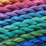 Cotton perle thread, beautifully smooth with a slight sheen, in skeins of approximately 25 yards; equivalent in thickness to something like a fine perle 8. Hand-dyed with Procion and, as always, I can't guarantee that anything is completely colourfast. Yardage estimates are approximate.