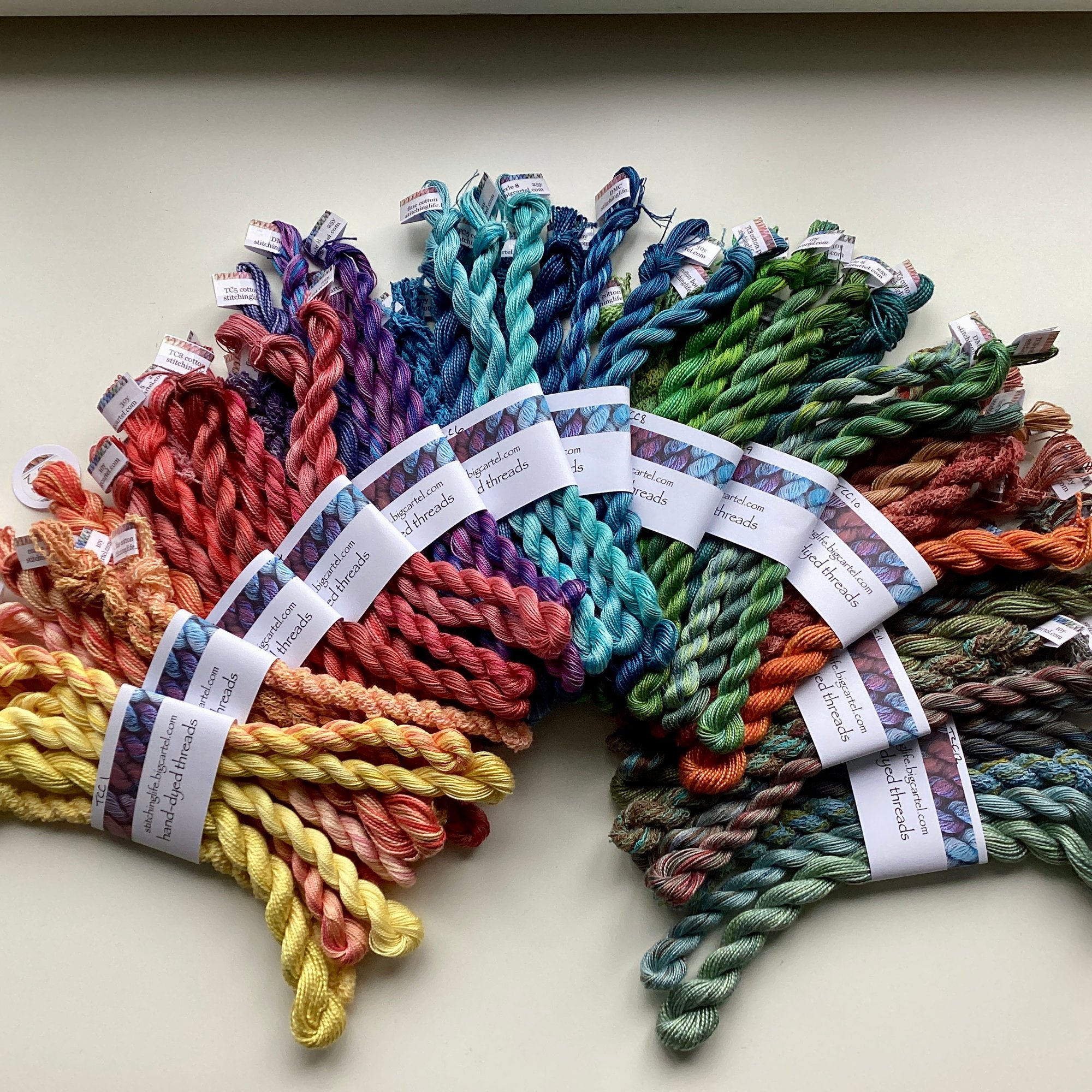 All threads have been hand dyed with Procion. While everything has been well washed and rinsed, I can't guarantee that any are completely colourfast. As always, colours are unique and unrepeatable, and yardage estimates are approximate.