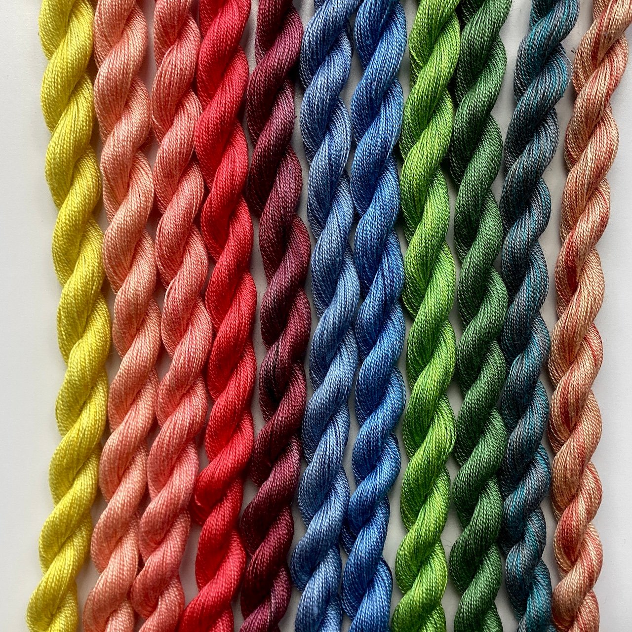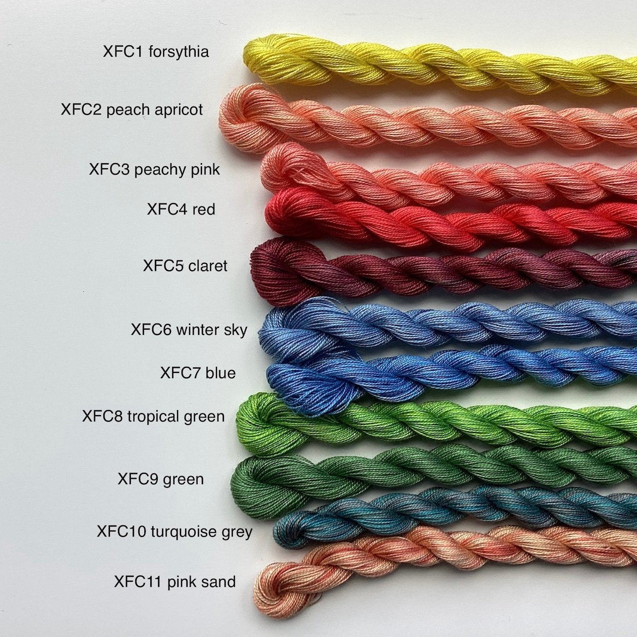 Very fine mercerised cotton thread in skeins of approximately 50 yards, hand-dyed with Procion. This thread is about half as fine as the standard fine cotton; slightly thicker than standard sewing machine thread, similar to hand-quilting cotton. Good for adding fine detail or small stitches. As always, I can't guarantee that anything is completely colourfast. Yardage estimates are approximate.