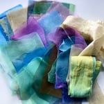 Silk is a beautiful fabric to work with. These are small pieces, ranging from about 5" x 7", 4" x 6" and smaller, to very tiny scraps, in a range of muted landscape colours. Average contents around 9-10 pieces of silk organza and around 13 silk chiffon plus a few scraps and a couple of yards of hand-dyed/tea-dyed silk ribbon. The silk ribbon is recycled from old saris and has seams and fraying edges. All fabrics have been hand-dyed with Procion fibre reactive dye; they have been well washed and rinsed but are not guaranteed colourfast (though they probably are).