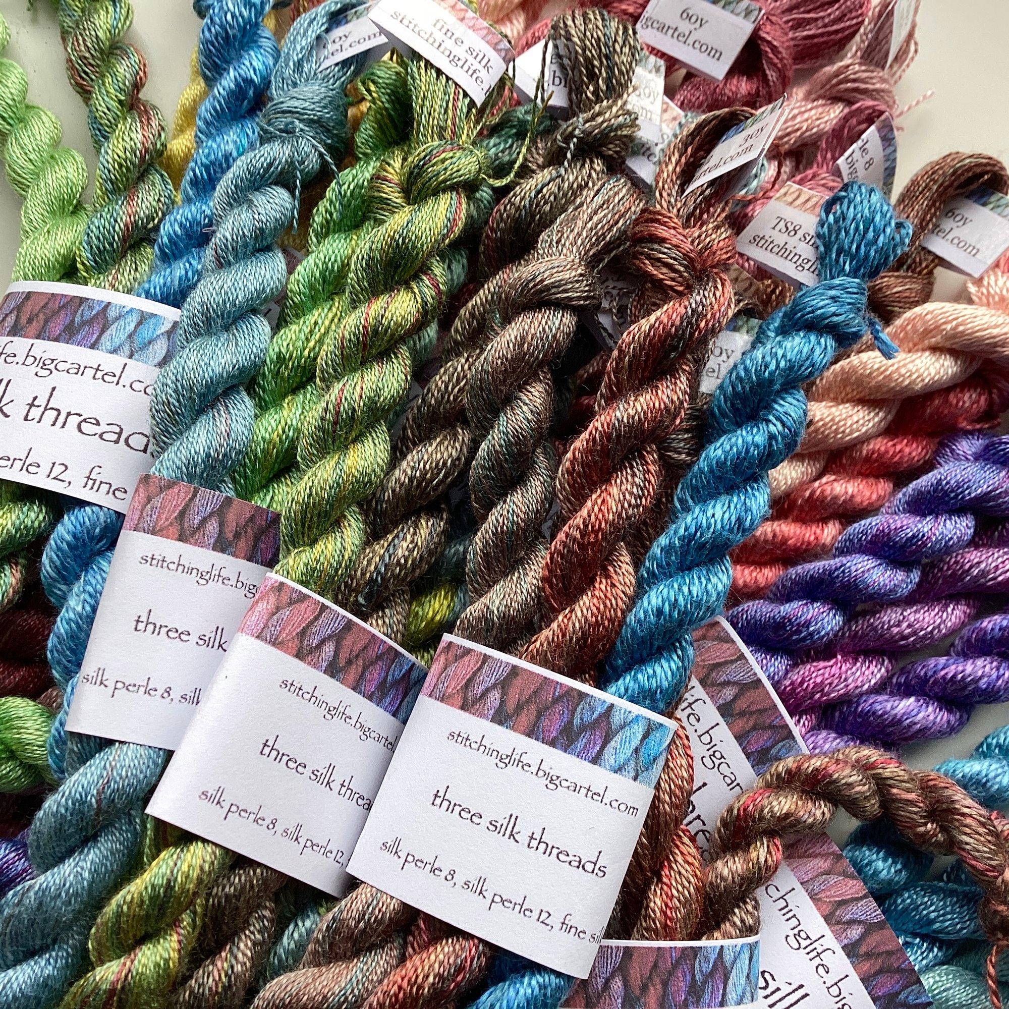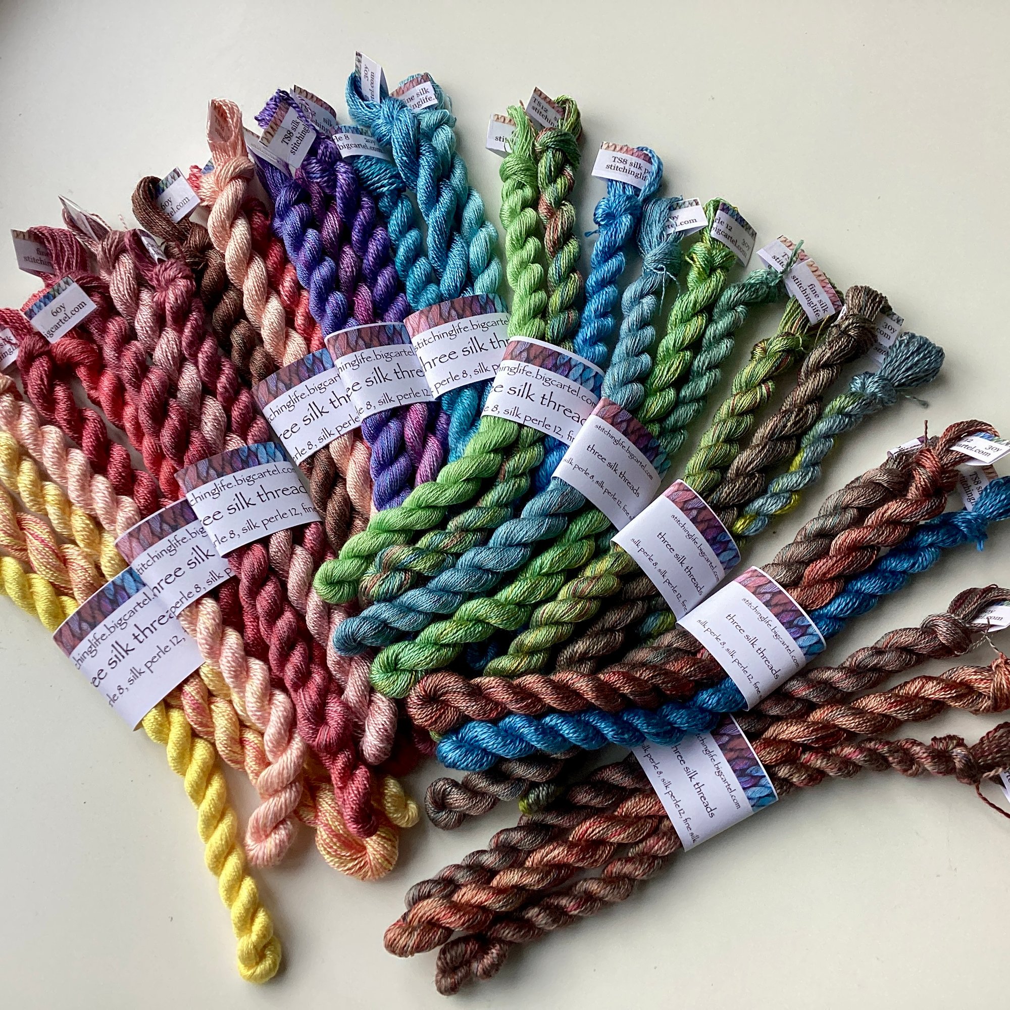All threads have been hand dyed with Procion. While everything has been well washed and rinsed, I can't guarantee that any are completely colourfast. As always, colours are unique and unrepeatable, and yardage quantities are approximate.