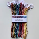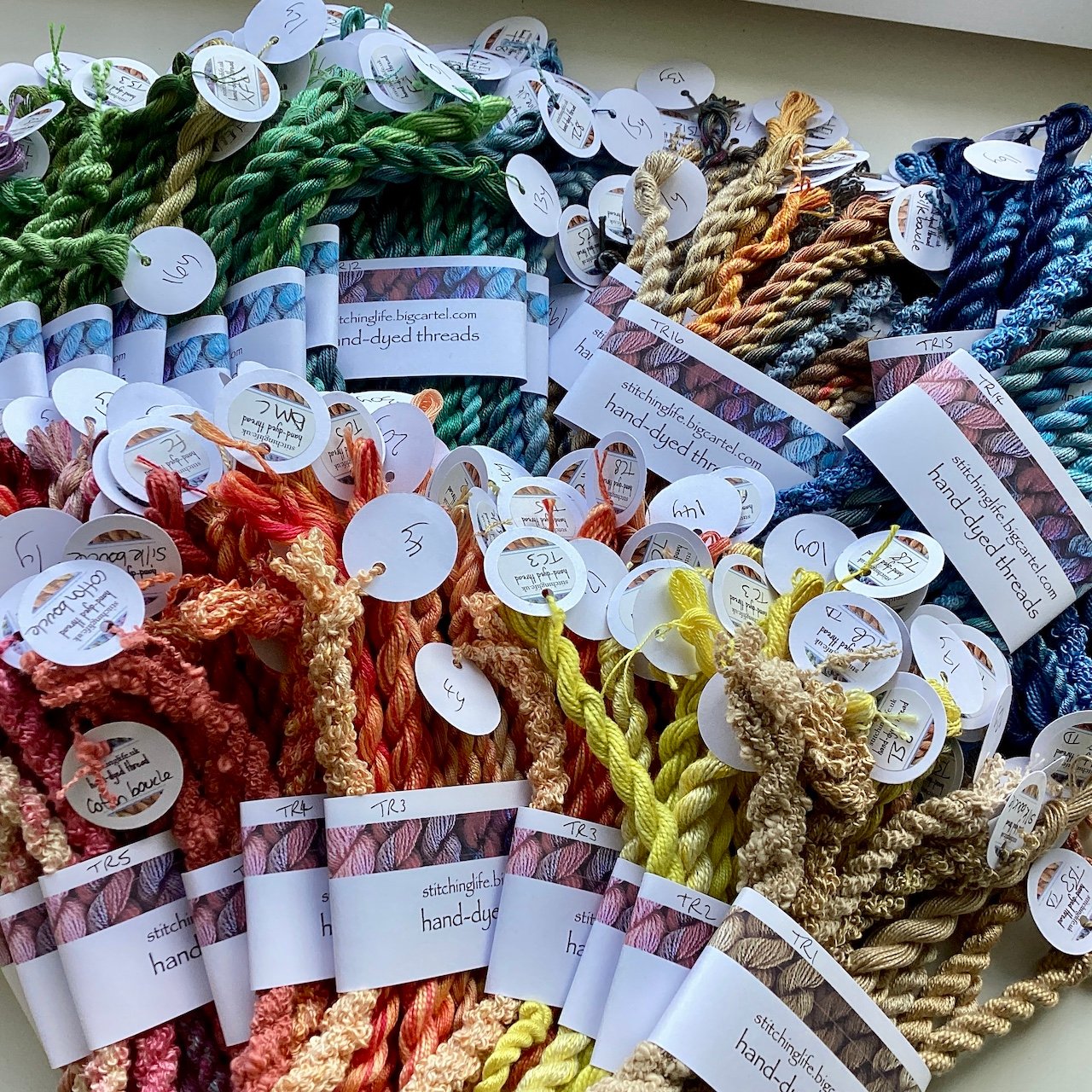 Threads have been dyed with Procion fibre-reactive dye and have been well-washed and thoroughly rinsed, but as always I don't guarantee colour-fastness. If your project will need washing, then please test a small amount first. Yardages are approximate.