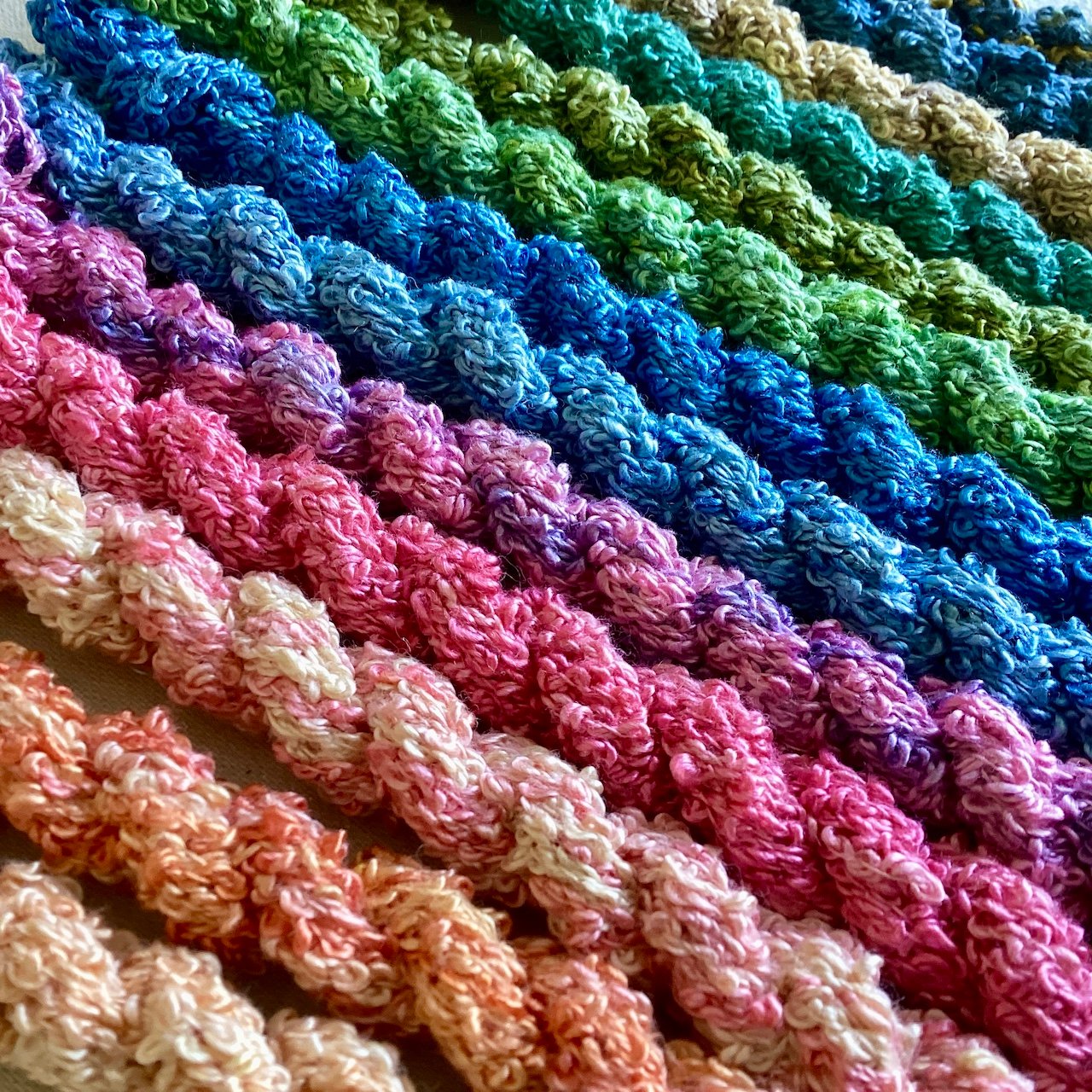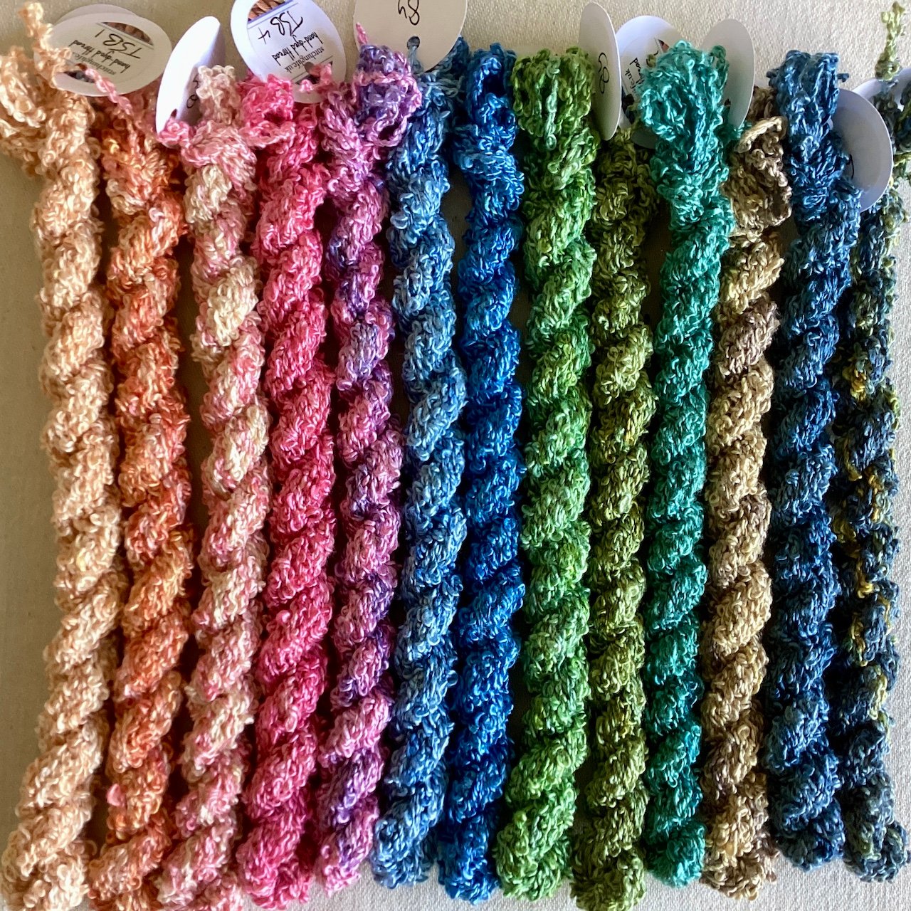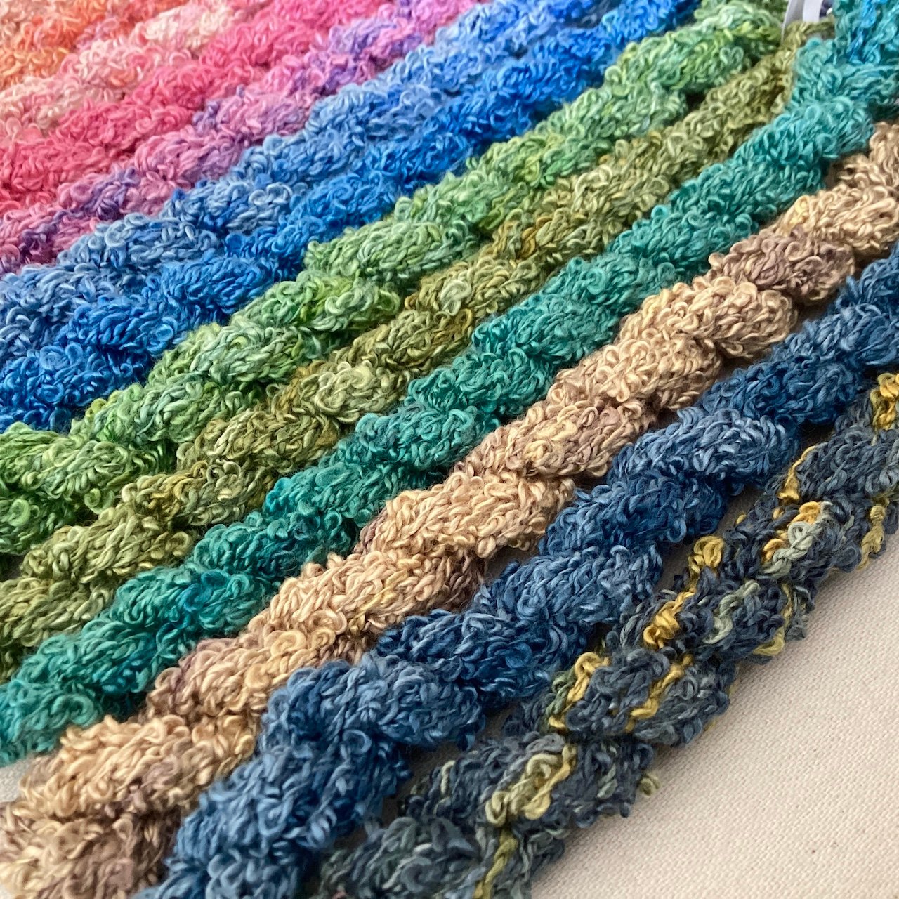 Textured silk boucle yarn in skeins of approximately 8 yards, hand-dyed with Procion as shown. Silk boucle is soft and lustrous with a subtle sheen - perfect for couching and adding texture to experimental embroidery. As always, colours are unique and unrepeatable, and I can't guarantee that anything is completely colourfast. Yardage estimates are approximate.