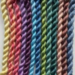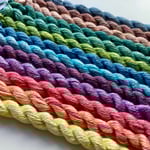 Mulberry spun silk thread (20/2nm) in skeins of approximately 20 yards, hand-dyed with Procion, and roughly similar to somewhere between a slightly chunky perle 8 or a fine perle 5.