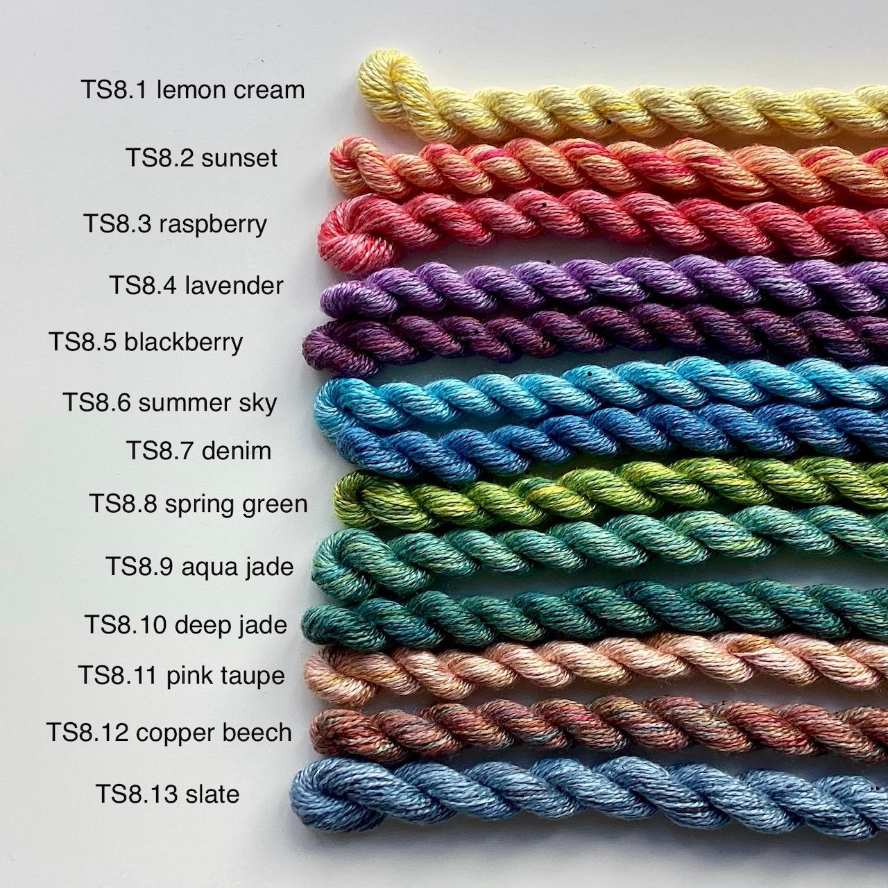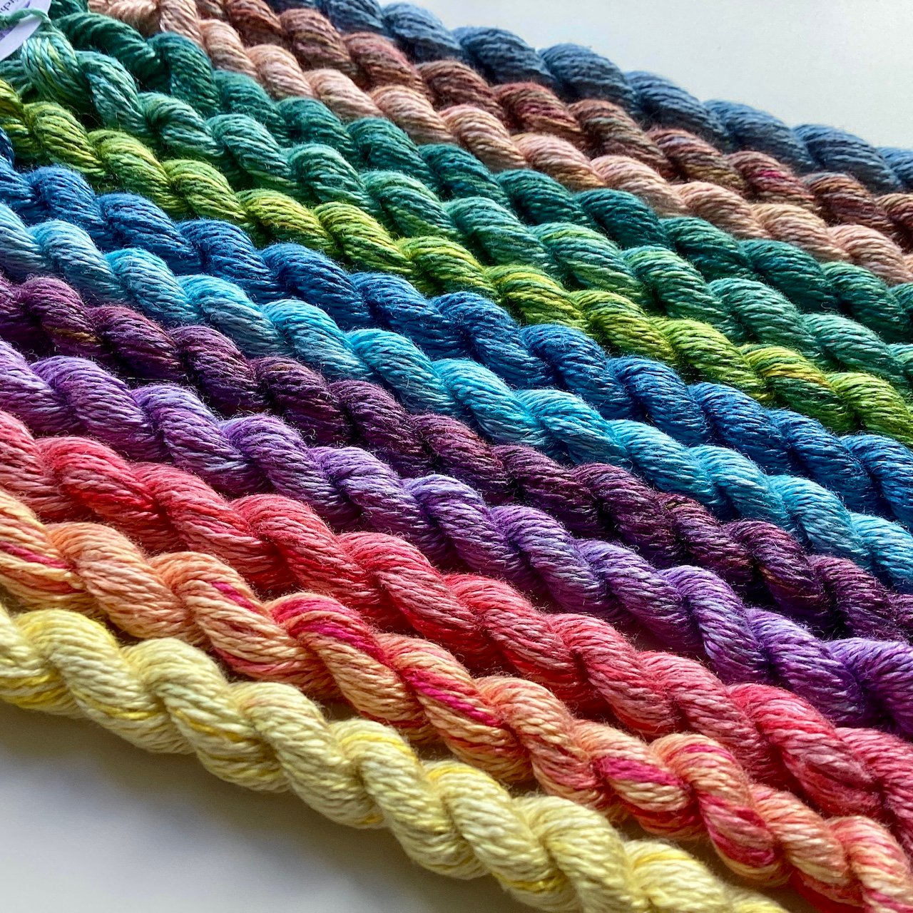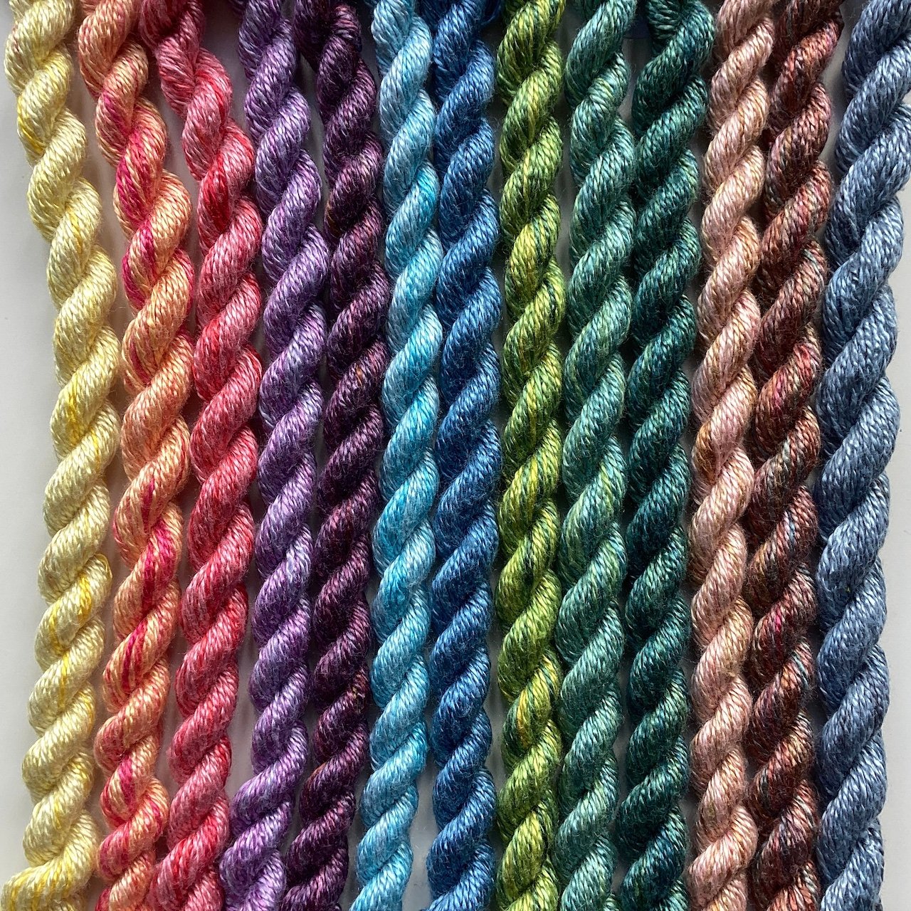 Silk thread has quite a high sheen, a beautiful soft texture, and is a lovely, luxurious thread to stitch with. Once you've stitched with silk thread you won't want to use anything else! As always, I can't guarantee that anything is completely colourfast. Yardage estimates are approximate.